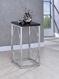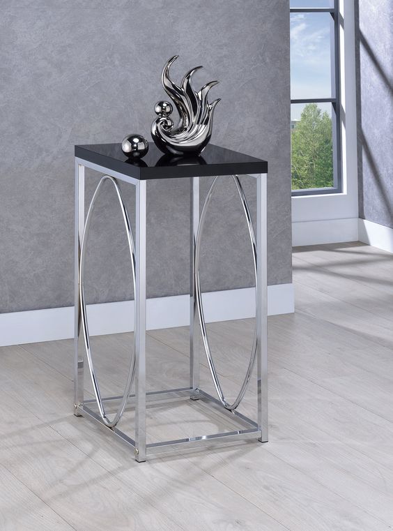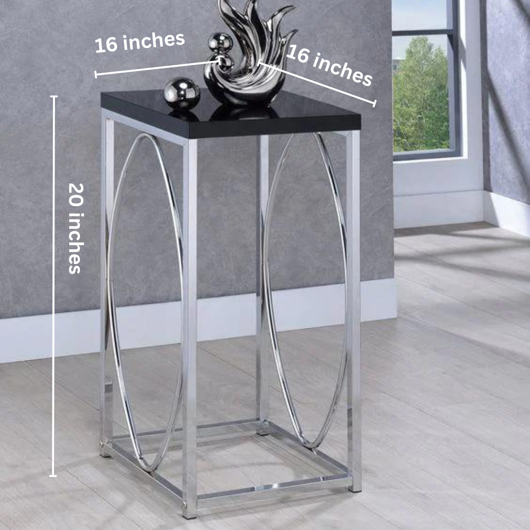 With square frame, that sports oval design elements, this contemporary accent table adds a great design aesthetic to any space. A brilliant chrome base gives a shine of color to the table, while a square, glossy white top offers a nice complement to the base. The simplistic design and coloring of the piece makes matching it to your existing decor simple.