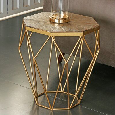 CORNER COLLECTION "Like a diamond in the rough" is the perfect way to describe this octagonal end table, which combines a faceted golden base with a unique parquet top of the recycled wood. This octagonal sunburst End Table blends with, and accents your living room collection. Gold geometric profile holds rays of reclaimed wood to create this side table an elegant choice for your open concept living space.