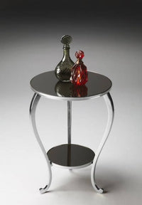 Collection Name: Modern Expressions - Shannon Title: Butler Specialty Modern Expressions Glass Top Accent Table Details: Magnificently modernized and exaggerated cabriole legs, coupled with a mirror glass top and matching lower shelf, raise the design bar to the sky with this exquisite and shimmering accent table. Crafted from iron and in a polished finish.