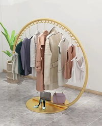 Showcase Style: Elevate your retail space with our Clothing Display Rack, a unique and novel solution for showcasing apparel. Crafted with a curved metal frame and a lower shelf, this creative coat rack offers both style and functionality. Perfect for wedding shops and clothing stores, its sleek design allows garments to hang elegantly while the lower shelf provides additional display space for accessories or folded items. Make a statement with our Clothing Display Rack and captivate customers with your curated collections.