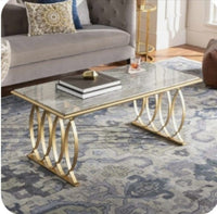 Elegant Fusion: Our Coffee Table seamlessly blends sophistication and modernity. Featuring a pristine white MDF top coupled with sleek gold metal legs, it exudes understated luxury. Perfect for any contemporary living space, this table adds a touch of glamour while providing a functional surface for your everyday needs. Elevate your decor with this timeless piece that effortlessly marries style and versatility, promising to be a stunning focal point in your home.