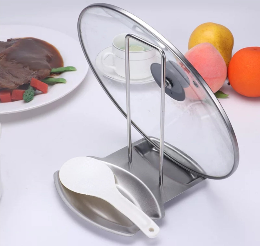 The Lid & Spoon Rest, Stainless Steel Pot Rack, is a sleek and practical addition to any kitchen. Crafted from durable stainless steel, this pot rack offers a convenient solution for keeping your cooking area tidy and organized.